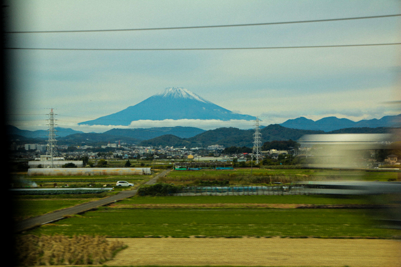 新幹線の窓から綺麗に見える富士山を横目に
